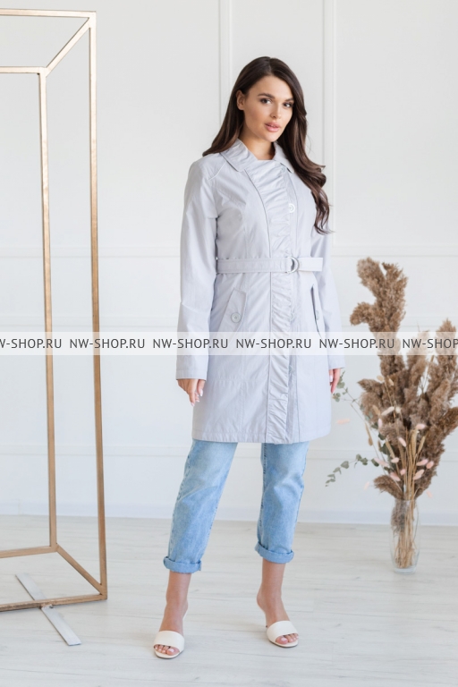Оригинальный женский плащ с поясом, главным украшением которого является привлекательная сборка на ветрозащитной планке, а также декоративные клапаны на карманах. Застежка на пуговицы, отложной воротник.