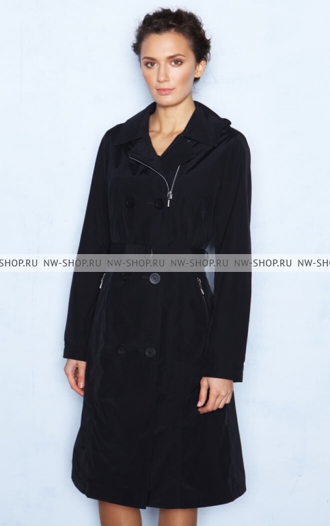 Стильный женский плащ с двубортной застежкой на пуговицы. Модель дополнена боковыми карманами на молнии и поясом. Съемный капюшон на кнопках.
