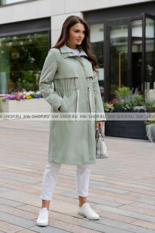 Модель 969 – плащ длиной 100 см из смесовой ткани (65% - хлопок, 35% - полиэстер). Особенности: декоративная тесьма в кулиске по талии, отлетная кокетка, съемный капюшон с модельной планкой, боковые разрезы на кнопках, встречная складка на спинке, дающая большую свободу движения. Изделие украшено брендированной фурнитурой (кнопки, молния, шильда), также имеются светоотражающие элементы на планке и в боковом шве. Цвета: серо-голубой, фисташковый. Размерный ряд – 40-52.