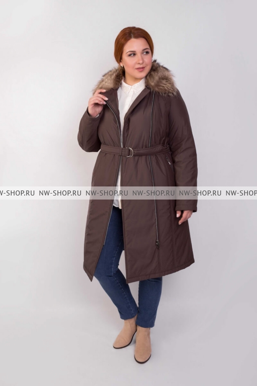 Зимнее женское пальто с натуральным мехом енот. Смещенная молния добавляет оригинальности в данную модель. В комплекте идет съемный капюшон. Модель доступна в темно-коричневом цвете.
